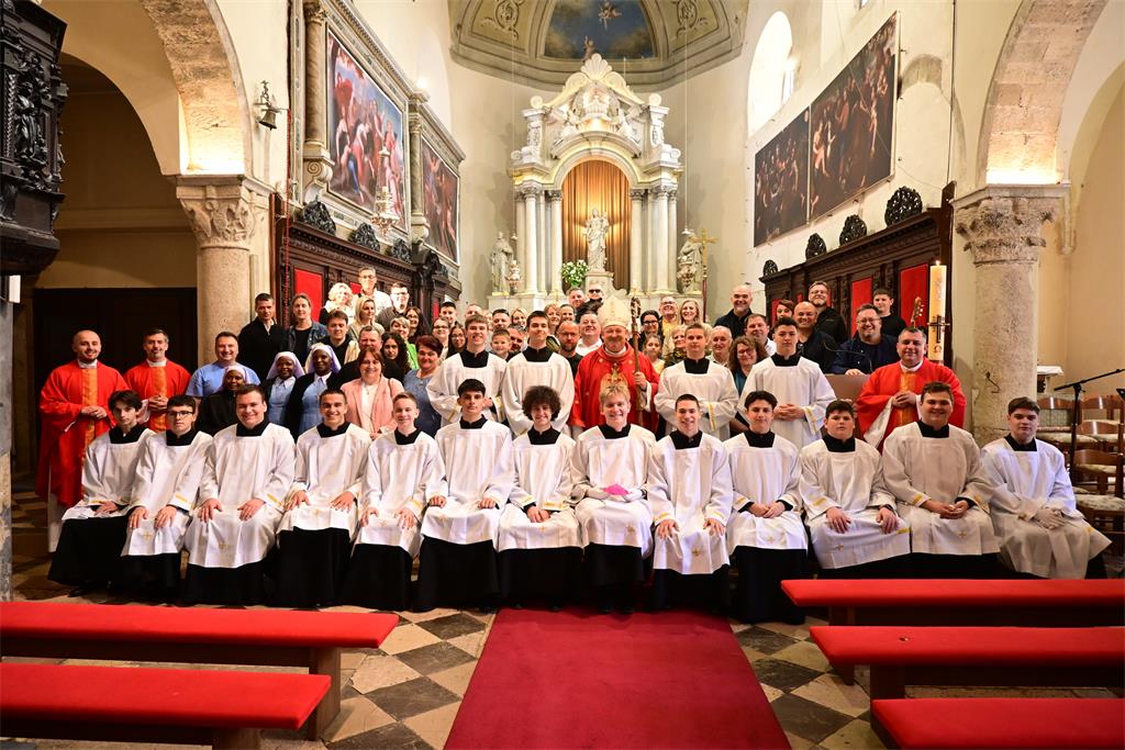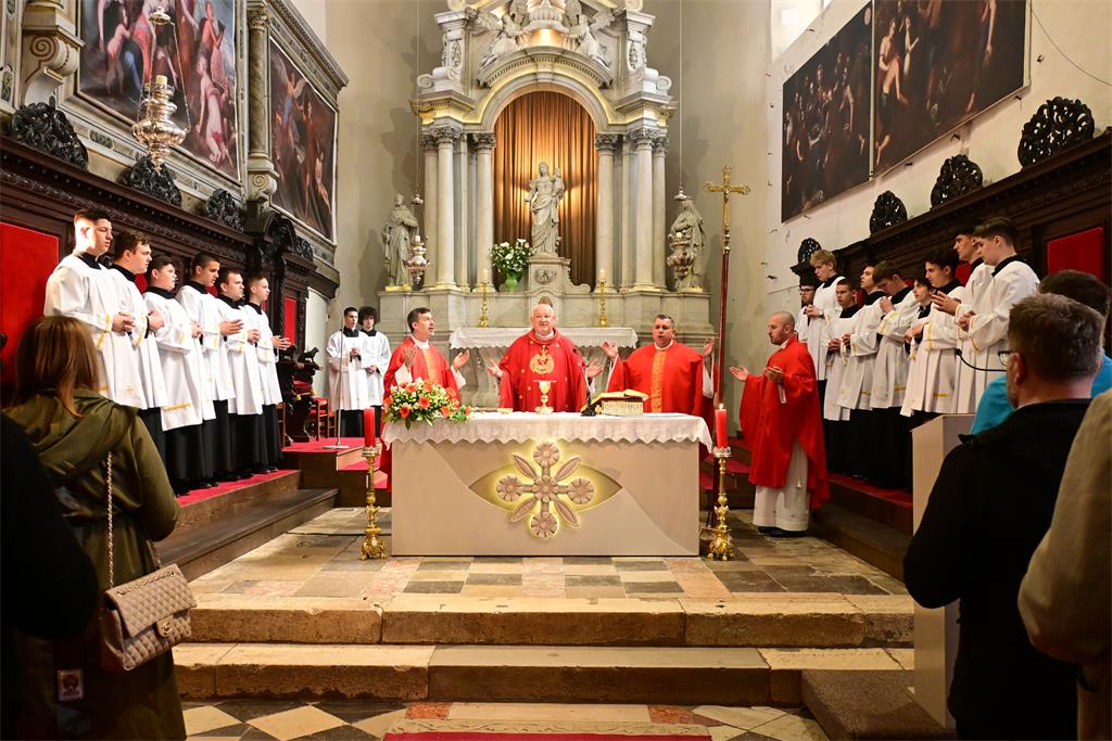 Poslije kratke okrjepe započelo je svečano misno slavlje u krčkoj prvostolnici koje je predvodio krčki biskup mons. Ivica Petanjak u koncelebraciji s rektorom preč. Matijom Pavlakovićem, duhovnikom sjemeništaraca vlč. Matkom Filipovićem i katedralnim župnikom don Vedranom Kirinčićem. Prigodnu homiliju izrekao je biskup Petanjak, a nakon svete mise okupljene je upoznao s bogatom poviješću grada Krka i same katedrale te je ukratko predstavio povjerenu mu biskupiju. Nakon zajedničke molitve na grobu sluge Božjega biskupa Antuna Mahnića, hodočasnici su imali prigodu i za kratku okrjepu u prostorima biskupskog ordinarijata.