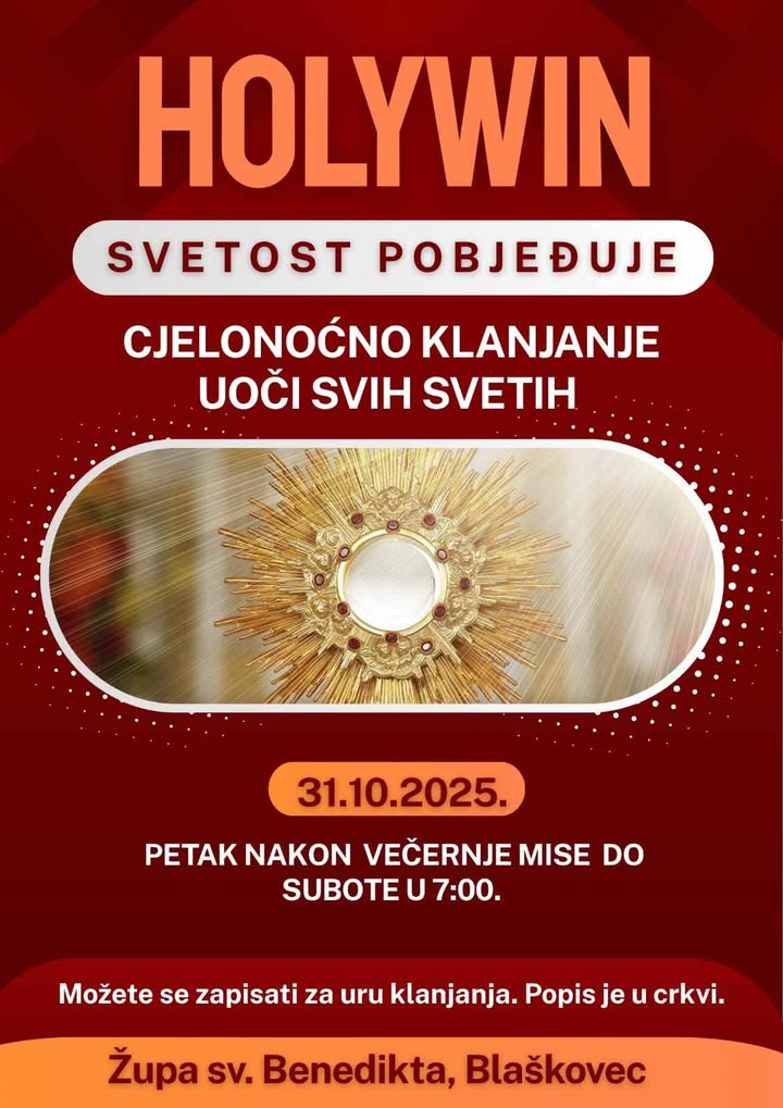 Holywin - cjelonoćno klanjanje uoči svetkovine Svih svetih - održat će se u Župi sv. Benedikta u Blaškovcu 31. listopada. Klanjanje će početi nakon večernjeg misnog slavlja, a trajat će do subote 1. studenoga u 7 sati.