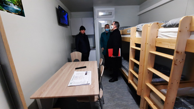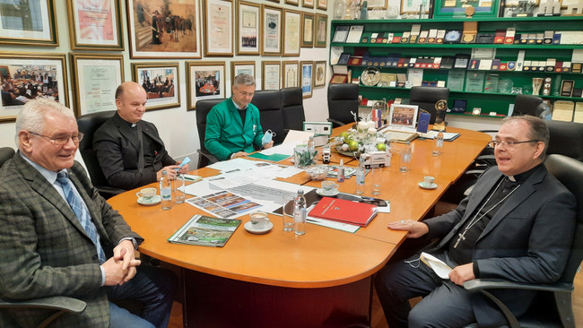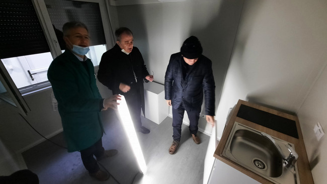 Prije potpisivanja ugovora predsjednik Hrvatskoga Caritasa varaždinski biskup Bože Radoš i mons. Svalina obišli su postrojenje i proizvodnju stambenih modula s voditeljem projekta Željkom Horvatom.