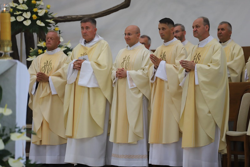 I ovu misu proslave jubileja – prva je služena u nedjelju, 14. kolovoza s brojnim hodočasnicima iz cijeloga svijeta – predvodio je mons. Marek Jedraszewski, krakovski nadbiskup i metropolit u zajedništvu s brojnim svećenicima iz Poljske, te iz Mađarske, Ukrajine, Bjelorusije, Ujedinjenog Kraljevstva i Hrvatske.