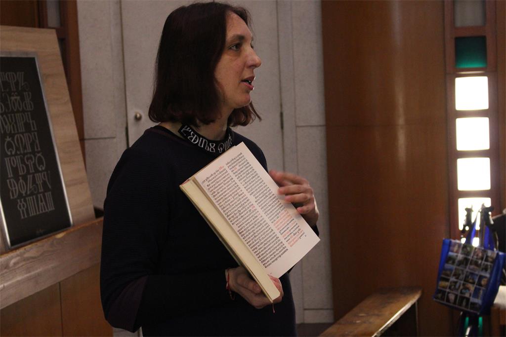 Predavanje na izložbi održala je dr. sc. Tanja Kuštović, docentica pri Katedri za staroslavenski jezik i hrvatsko glagoljaštvo na Odsjeku za kroatistiku Filozofskoga fakulteta Sveučilišta u Zagrebu. U vrlo bogatom i zanimljivom četrdeset petominutnome predavanju na sažet je način prezentirala osnovne podatke o glagoljskome pismu, prvom slavenskom književnom jeziku te o glagoljskim knjigama koje se nalaze u samostanu sv. Franje Ksaverskoga u Zagrebu. Nakon kratkoga prikaza oblika glagoljskoga pisma (obla, uglata, kurzivna glagoljica) te osnovnih podataka o nastanku i razvoju slavenske pismenosti, okupljenima je predstavila glagoljske knjige koje su bile izložene. Samostan na Ksaveru iza svojih zidova čuva najstariji hrvatski tekst pisan latinicom (