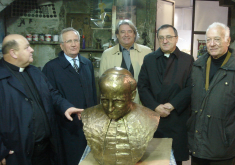 Slika (slijeva stoje): mons. Ivan Hren, prof. dr. Đuro Zalar, ravnatelj Ljevaonice mr. Željko Mačešić, mons. Stjepan Večković, akademski kipar Stanko Jančić