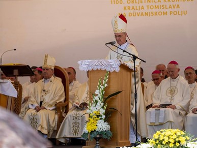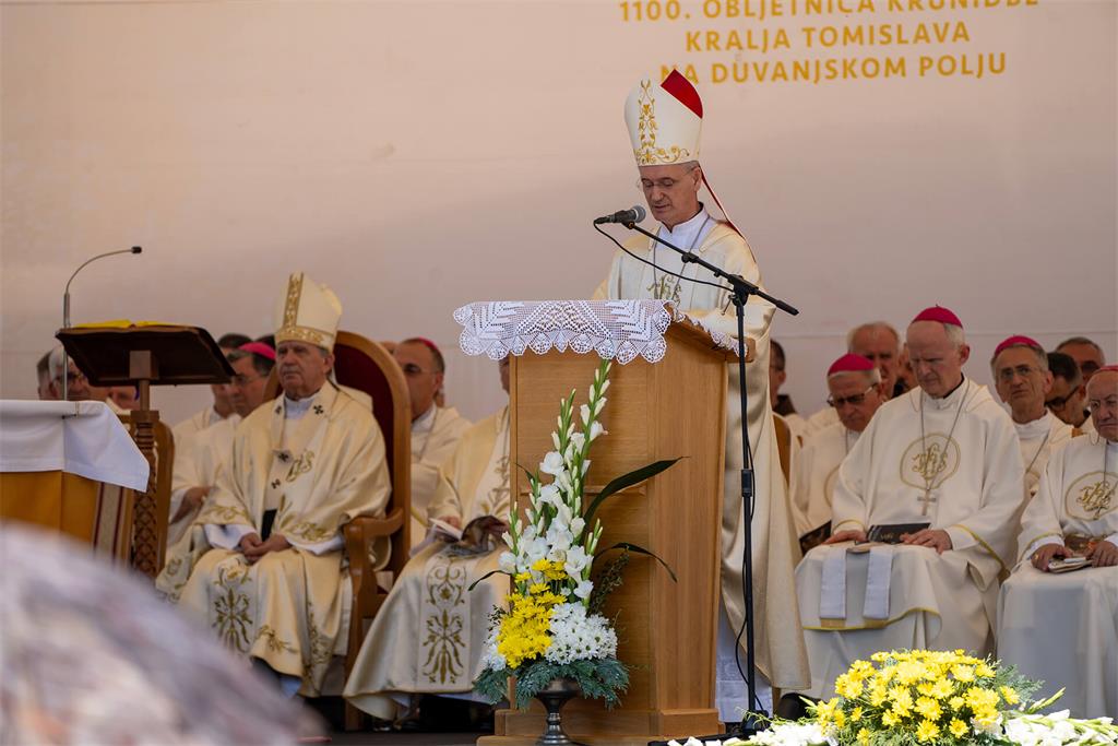 propovijedi se osvrnuo na krunidbu kralja Tomislava, istaknuvši da je ona bila „vidljiv znak i trajan zalog nade svoje budućnosti“. „Danas stojimo na svetom mjestu, pokraj spomen-crkve koju je hrvatski narod odlučio podići u povodu tisućite obljetnice krunidbe kralja Tomislava kao vidljiv znak i trajan zalog nade svoje budućnosti. Taj čin nije bio tek simboličan ni protokolaran; bio je to duhovni čin pamćenja, prisjećanje na ukorijenjenost hrvatskoga naroda u kršćansku vjeru koja je srce kulture, u baštinu koja nas je oblikovala tijekom stoljeća. To je bio spomen-čin naroda koji je svoju budućnost odlučio povjeriti Bogu i Crkvi; naroda koji je tada, kao što to činimo i mi danas, svjesno izabrao živjeti ne samo u zemaljskoj slobodi, nego u svjetlu Božje istine koja oslobađa i daje smisao svemu“, rekao je nadbiskup Kutleša.