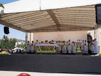 pozdrav je uputio apostolski nuncij u Bosni i Hercegovini i Crnoj Gori nadbiskup Francis Assisi Chullikatt. Među ostalim, naglasio je da, dok sveopća Crkva živi Jubilejsku godinu nade, slavenski narodi i cijela Europa sjećaju se svetih Ćirila i Metoda, apostola slavenskih. „Na ovaj isti dan, vi, dragi vjernici Hrvati, s opravdanim ponosom slavite 1100 (tisuću sto) godina od krunidbe vašeg prvog kralja, Tomislava, i drevne crkvene sabore u Splitu: ključne trenutke vaše kršćanske povijesti i vašeg narodnog identiteta. Ovdje, na ovom duvanjskom polju, susreću se pamćenje i vjera: prošlost i sadašnjost dodiruju se poput dviju ruku sklopljenih u molitvi. Ovdje se obnavlja duboki osjećaj pripadnosti: Kristovoj Crkvi, zajedništvu s Petrovim nasljednikom, vašoj duhovnoj baštini, koju je evanđelje oblikovalo i kovalo tijekom stoljeća“, rekao je, među ostalim, nuncij Chullikatt.