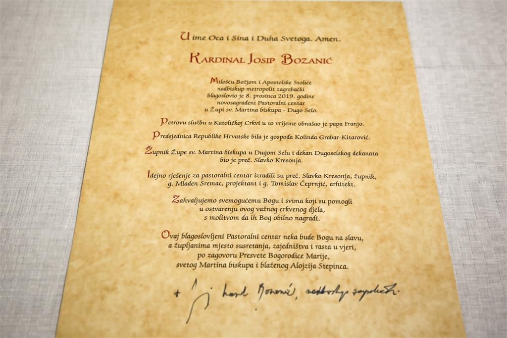 Nakon euharistijskoga slavlja uslijedio je svečani blagoslov novosagrađenoga pastoralnog centra u kojem će se, prema riječima vlč. Kresonje, župna zajednica okupljati te zajedno razmatrati nad tajnama i milostima koje Gospodin pred nju postavlja, kao i sve ono drugo što bude na korist župnoga zajedništva. Budući da je Kardinal prije završnoga euharistijskoga blagoslova posvjedočio san o izgradnji gradskoga crkvenog trga koji će s pastoralnim centrom biti povezan podvožnjakom te tako dati posebno značenje župnome središtu, prilikom blagoslova centra naglasio je da ovom posebnom prigodom za Župu, ali i Grad Dugo Selo, započinje jedna nova povijest: povijest okupljanja. - Radost Gospodnja vaša je jakost. (Neh 8,10) – poručio je Kardinal, blagoslivljajući nove prostorije. Podsjetio je također i na radost okupljanja hrvatske katoličke mladeži sljedeće godine u Zagrebu na jedanaestom Susretu hrvatske katoličke mladeži, pozivajući mlade na sudjelovanje te da se odazovu biti dobrim domaćinima mladima koji će tih dana, slaveći Gospodina, boraviti u Zagrebu.