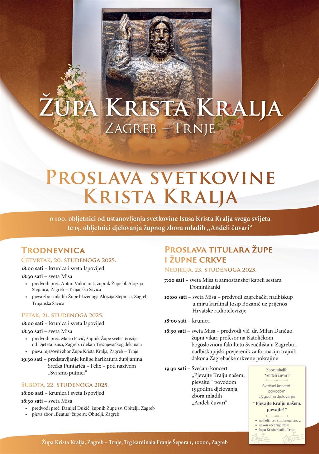 Župa Krista Kralja u zagrebačkom naselju Trnje proslavit će župnu svetkovinu u nedjelju 23. studenoga, a središnje euharistijsko slavlje u 10 sati predvodit će zagrebački nadbiskup u miru kardinal Josip Bozanić.