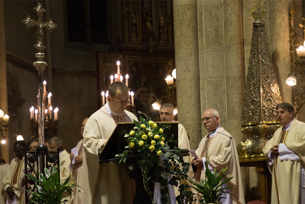 Na početku misnoga slavlja vlč. Jakov Rađa, povjerenik za pastoral duhovnih zvanja i promotor kršćanskih poziva, pročitao je čestitku pape Franje povodom 350. obljetnice Sveučilišta u Zagrebu u kojoj Papa, između ostaloga, udijelivši apostolski blagoslov, piše: – Bogoslovne je studije pokrenuo biskup Stjepan II. Babunić već u 13. stoljeću. Podupirali su ih njegovi nasljednici, među njima bl. Augustin Kažotić, a uzdignuti su na sveučilišnu razinu carskom poveljom od 23. rujna 1669. koju je potvrdio Hrvatski sabor 3. studenoga 1671. U tim je okolnostima udaren temelj i Sveučilištu u Zagrebu u čijem sklopu bogoslovni fakultet djeluje sve do sada. Tijekom povijesnih previranja, koja katkada nisu bila povoljna za Crkvu, fakultet je umijevao navješćivati istinu kršćanske vjere, promicati evanđeoske kreposti i poticati razvoj umjetnosti i kulture. Stoga mi je želja da fakultet i dalje pruža svoj dragocjen doprinos crkvi u Hrvata i čitavome društvu. –