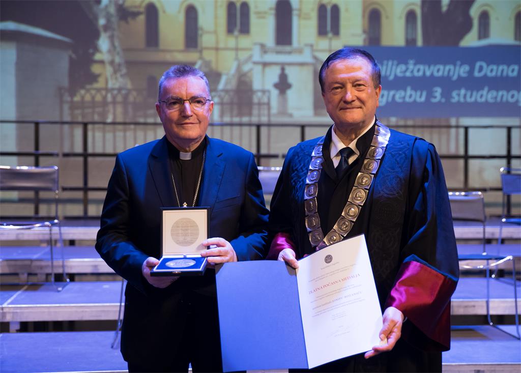 Zagrebačkomu nadbiskupu kardinalu Josipu Bozaniću uručena je zlatna počasna medalja Sveučilišta u Zagrebu za izniman doprinos u promicanju teoloških znanosti i afirmaciji hrvatskoga identiteta i hrvatske kulturne baštine na Sveučilištu u Zagrebu. Iz ruku rektora prof. dr. Damira Borasa medalju i plaketu zagrebački nadbiskup i veliki kancelar Katoličkoga bogoslovnoga fakulteta primio je u srijedu 3. studenoga na svečanoj sjednici Senata koja je upriličena uz Dan Sveučilišta i početak 353. akademske godine u Hrvatskom narodnom kazalištu u Zagrebu. Počasna medalja kardinalu Bozaniću dodijeljena je na preporuku Rektorskoga kolegija u užem sastavu, a odluku je donio rektor Boras 25. listopada, koji je na svečanosti govorio o povezanosti Sveučilišta i Katoličke Crkve koja stoji u njegovu utemeljenju.