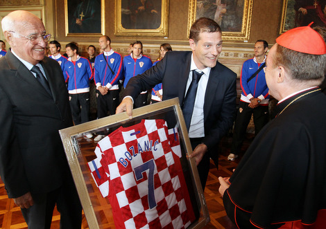 Na kraju svog govora Predsjednik nogometnog saveza uručio je Kardinalu staklenu loptu s ispisanim datumom današnjeg posjeta, izbornik nogometne reprezentacije Slaven Bilić uručio je Kardinalu dres hrvatske nogometne reprezentacije s njegovim prezimenom i brojem sedam, a kapetan Hrvatske nogometne reprezentacije Dario Srna uručio je Kardinalu nogometnu loptu Hrvatskog nogometnog saveza s potpisima igrača.