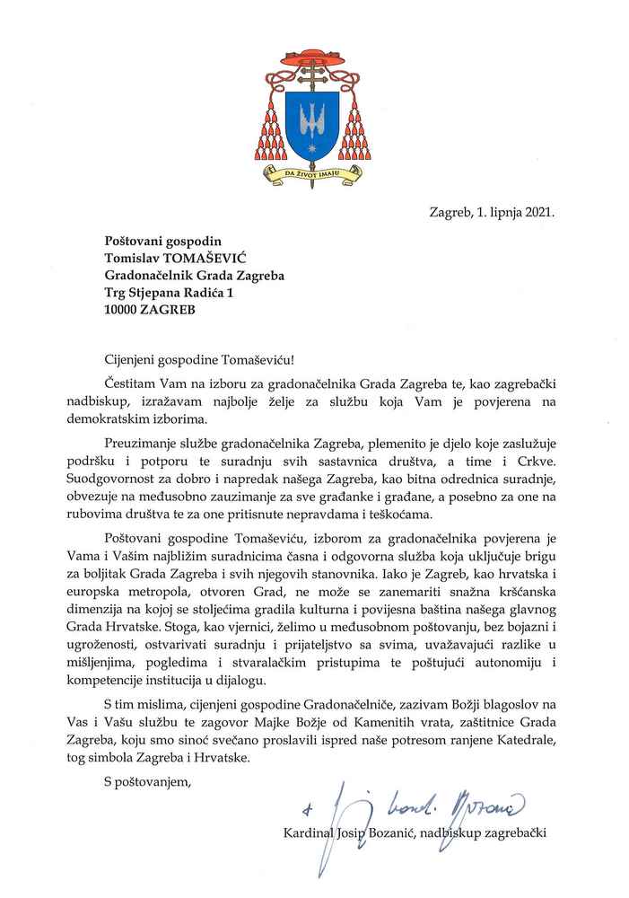 Zagrebački nadbiskup kardinal Josip Bozanić uputio je u utorak, 1. lipnja 2021. godine čestitku novoizabranom gradonačelniku grada Zagreba gospodinu Tomislavu Tomaševiću.