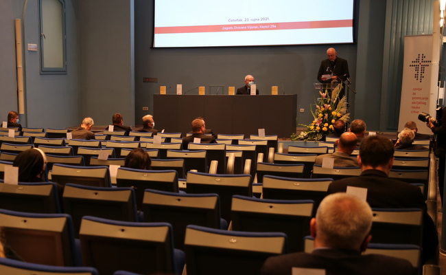 Pozdravnu riječ uputili su i mons. Giorgio Lungua, apostolski nuncij u Republici Hrvatskoj, mons. Želimir Puljić, predsjednik HBK i mons. Đuro Hranić, predsjednik Upravnog vijeća Centra za promicanje socijalnog nauka Crkve HBK.