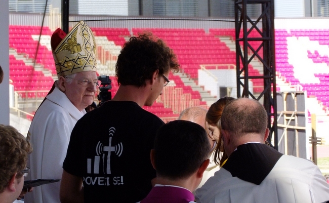 Foto: Nakon popričesne molitve kardinal Scola blagoslovio je jubilarni križ Beogradske nadbiskupije, a sudionici susreta mladih pročitali su svoj proglas te se rukovali s kardinalom Scolom.