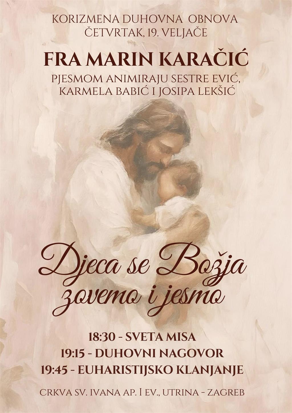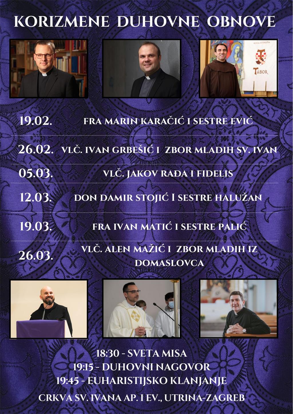 U korizmi ove godine u Župi sv. Ivana ap. i ev., Utrina-Zapruđe, održavat će se korizmene duhovne obnove četvrtkom, koje će predvoditi različiti svećenici i zborovi.