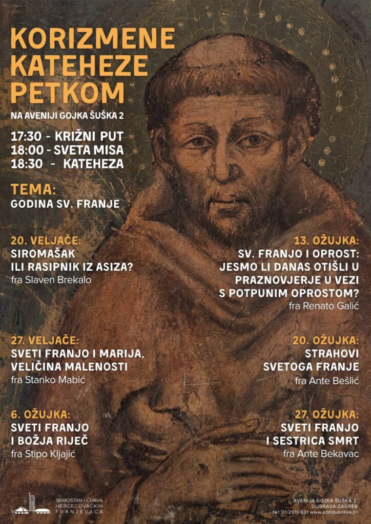 U samostanskoj crkvi hercegovačkih franjevaca u zagrebačkoj Dubravi već se tradicionalno održavaju korizmene kateheze. Tema ovogodišnjih kateheza je Godina sv. Franje budući da je papa Lav XIV. odredio da se od 10. siječnja 2026. do 10. siječnja 2027. slavi jubilarna godina povodom 800. obljetnice smrti Franje Asiškog.