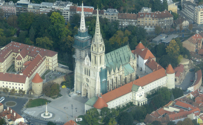 Biskup Eberhardt (1397.-1406. i 1410.-1419.) angažira majstore praškog Parlerova kruga za podizanje zidova obiju bočnih lađa, stupova lađa i zvonika. Ivan IV de Alben (1421.-1433.) dovršava zidove lađa, a biskup Osvald (1466.-1499.) priprema presvođenje, koje je uslijedilo za biskupa Luke Baratina (1500.-1510.), jednostavnim križnim svodom, a ne mrežastim, zacrtanim u doba biskupa Eberharda. Godine 1529. glavno je pročelje oštećeno topovima u dinastičkim borbama, kada je uništen portal i velika rozeta na glavnom pročelju. Novi, figuralno ukrašeni portal, danas u fragmentima u Muzeju grada Zagreba, izradio je majstor Kozma Miler iz Krškog u Kranjskoj 1640. Novi, južni, šesterokatni, danas pregrađeni zvonik sagradio je 1633.-1644. Hans Albertal iz Dillingena u Njemačkoj“, sažima obrazloženje ranu povijest katedrale.