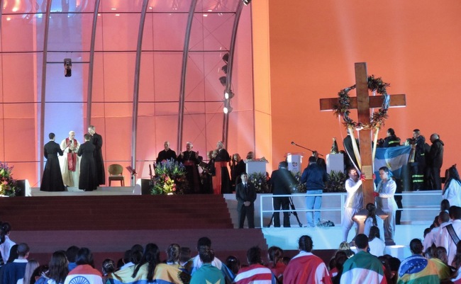 Nakon što je u petak 26. srpnja rano poslijepodne ručao s dvanaestero mladih sa svih pet kontinenata, papa Franjo se u 18 sati po lokalnom vremenu, a u 23 po srednjeeuropskom, vratio na Copacabanu gdje je s više od milijun mladih razmatrao o Kristovoj muci. Znakovitim i spektakularnim uprizorenjem postaja Križnog puta, uz glazbenu pratnju nadahnutu na Beethovenovim djelima, sa više od 280 umjetnika i „glumaca", mladi su kroz 13 postaja postavljenih na 900 metara dugom putu nosili ukrašeni križ Svjetskih dana mladih, da bi ga na 14. postaji uzdigli na podij s Papom gdje je prikazana 14 postaja.