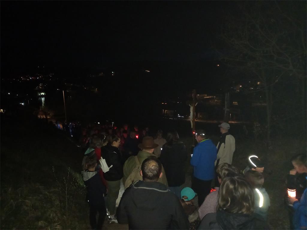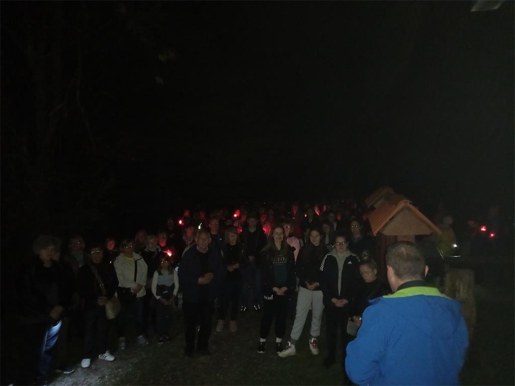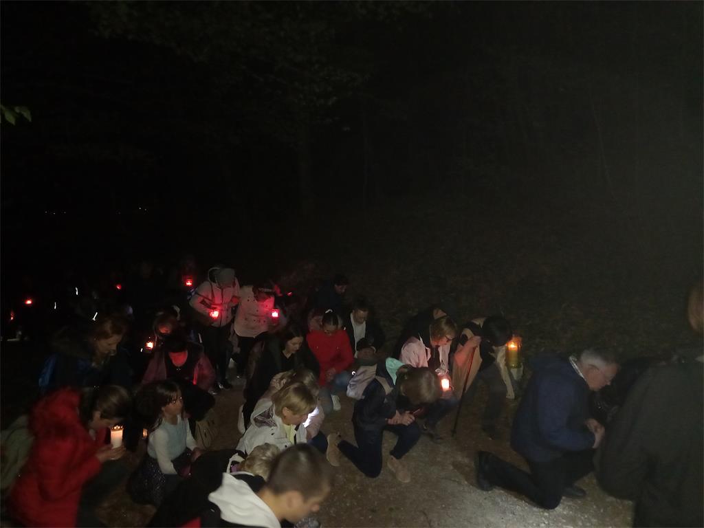 Na svakoj postaji križnog puta nakratko bi se zaustavilo i pomolilo. Kako je križni put tekao dalje, tako se zalazilo dublje u mračnu šumu, no okupljeni su vjernici obasjali put svjetiljkama i lampionima, ali i skrušenom molitvom i zajedništvom. Mrak i šumski put nisu pokolebali župljane, već su se ustrajno i u žaru molitve uspinjali do posljednje postaje.