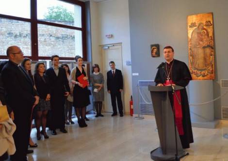 Dragi Borise, ikone koje su tvoje, ali su ikone Crkve i njezine vjere, velikodušno si postavio pred nas, da bismo mi bili izloženi. Ovo je naime, obratna izložba. Večeras, umjesto da otvaram izložbu, molim Boga da otvori nas. Mi smo izloženi pogledu našega Gospodina, pogledu Isusa i Blažene Djevice Marije, svetih, pogledu Duha Svetoga, koji nam omogućuje da u međusobnim susretima vidimo istinu i da u njoj budemo posvećeni; da komuniciramo, da se uzajamno obogaćujemo istim Duhom.