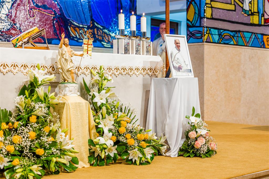 Govoreći o papi Franji mons. Sente naglasio je da kao da je htio biti "svjetski župnik, univerzalni župnik i pomoći svakom čovjeku koji traži Boga poput ove dvojice koji u nekom strahu putuju životom. Naš je papa Franjo svojim djelovanjem nastojao tu Kristovu radosnu vijest, za kojom svaki čovjek čezne jer svaki čovjek želi biti zadovoljan, sretan, radostan, približiti i pomoći da ju razumije. Poglavito se zanimao za one rubne koji su bili odbačeni, koje nisu razumjeli. Papa je svim svojim djelovanjem pokazivao veliku brigu za odbačene, rubne, ovom svijetu nevažne. Kako ne voljeti papu Franju, osobito mi ovdje u Nacionalnom svetištu svetog Josipa, kad je toliko naglašavao važnost svetog Josipa. Za Papu je izabran 13. ožujka, a 19. ožujka, na svetkovinu svetog Josipa, zaručnika Blažene Djevice Marije, svečano je inauguriran na Trgu svetog Petra. Poznata je činjenica iz njegova života da se često molio svetom Josipu, osobito Josipu koji spava. Kad je naišao na probleme kojima nije znao rješenje, zapisao ih je na papirić te taj papirić sa zapisanom problemom stavio pod kip svetog Josipa moleći da ga nadahne pravi rješenjem."
