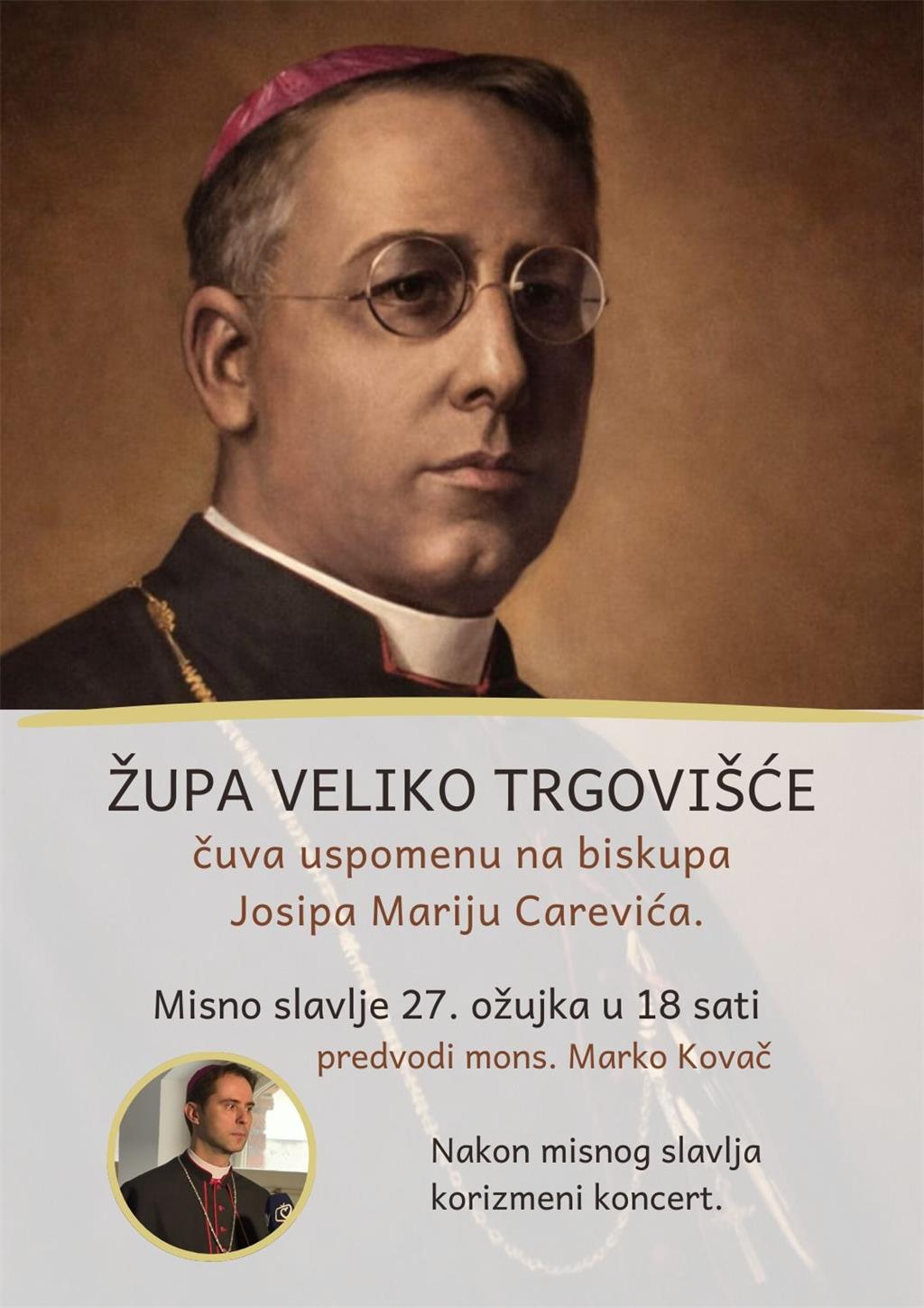 Pomoćni biskup zagrebački mons. Marko Kovač predvodit će u petak 27. ožujka u župnoj crkvi Blažene Djevice Marije od sedam žalosti u Velikom Trgovišću misno slavlje u 18 sati za pokojnog umirovljenog dubrovačkog biskupa Josipa Carevića o godišnjici biskupovog nestanka i ubojstva. Nakon misnoga slavlja slijedi korizmeni koncert.
