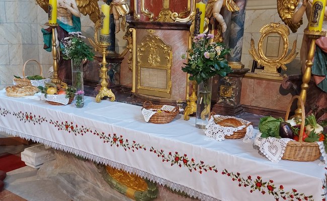 Darove na oltar uz prigodne tekstove prinijeli su naša djeca iz Osnovne škole Ksavera Šandra Djalskog koji su prinosili na dar: kruh, vino, žito, voće i povrće, grožđe, cvijeće, zemlju i ostale plodove koje je pripremila naša župljanka Zlatica Čefko, a vjeroučiteljica Ksenija Miškulin prigodne tekstove uz darove.
