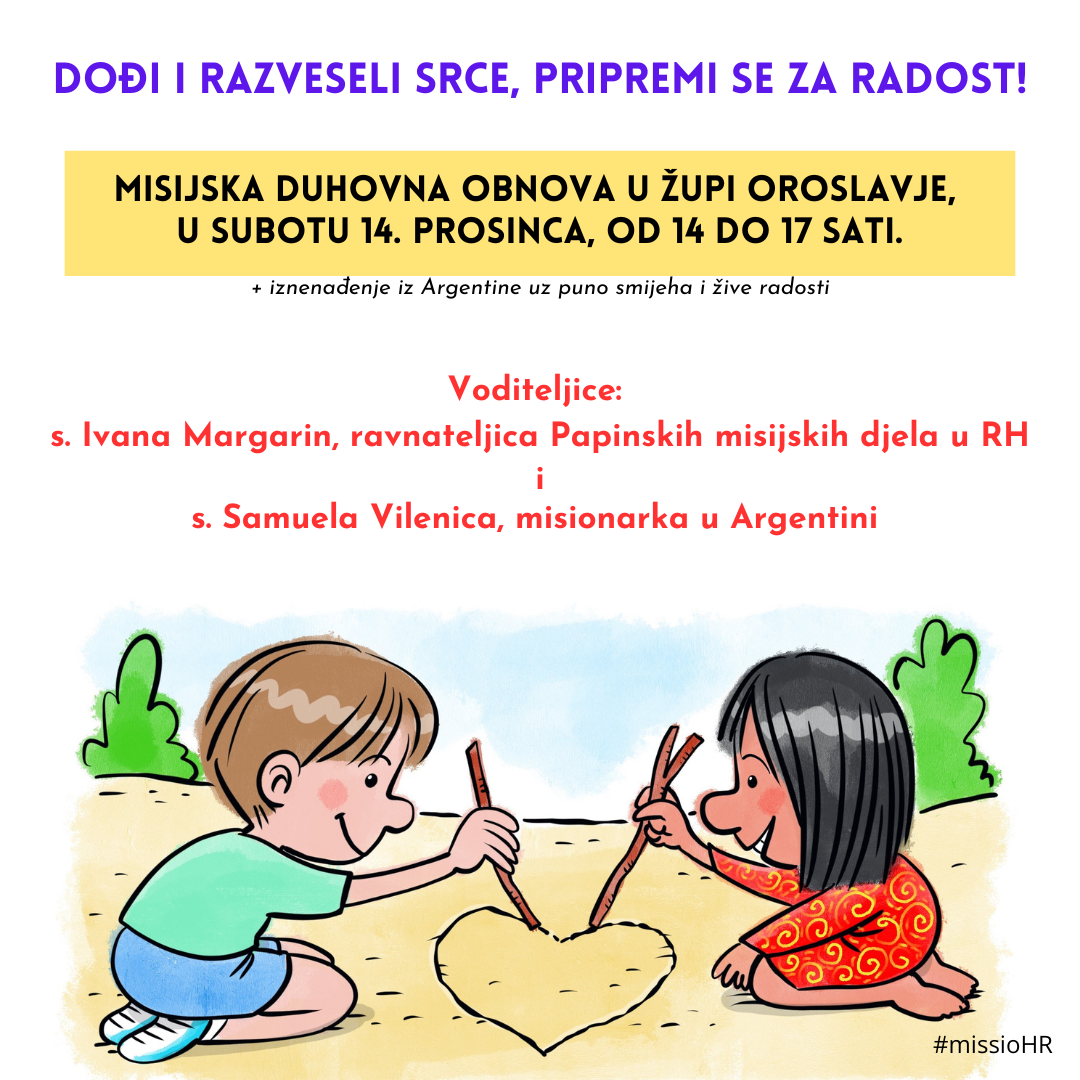 Misijska duhovna obnova održat će se 14. prosinca u župi Oroslavje, s početkom u 14 sati i domaćin je upravitelj župe vlč. Ivan Lastovčić. Završetak je u 17 sati, druženjem i iznenađenjem iz Argentine.