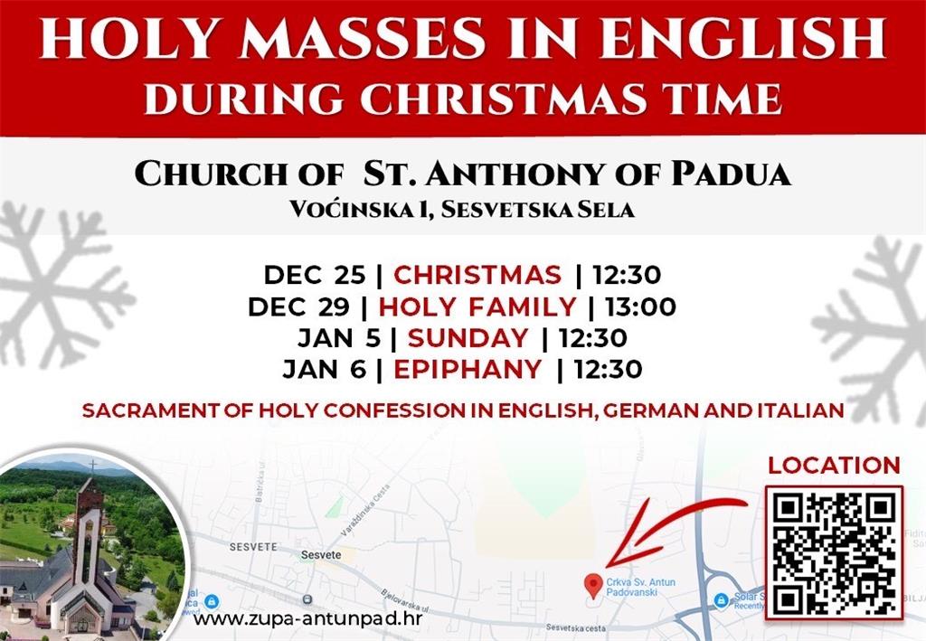 Božićna misa na engleskom jeziku u održat će se u Župi sv. Antuna Padovanskog u Sesvetskim Selima. Također, bit će moguće pristupiti sakramentu ispovijedi na engleskom, njemačkom i talijanskom jeziku.