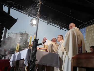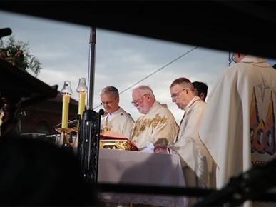 U homiliji mons. Gallagher kazao je: "Iz pepela požara, iz razaranja ovoga grada, pojavio se sačuvan lik Marije, Majke Božje od Kamenitih vrata, slika koja je - kao očuvana milosrđem nebeskoga Oca - u trpljenjem pogođenima i dezorijentiranim građanima, zajedno s divljenjem, pobudila, upalila i nadu. U današnjemu svijetu ne nedostaje prizora tragičnih razaranja. Mnoga od njih uzrokovana su prirodnim pojavama, ali mnoga, nažalost, i onom ljudskom besmislenošću koju papa Franjo već poduže definira "trećim svjetskim ratom u komadićima" koji se pretvara u "istinski i pravi globalni sukob". Evo zašto je dobro da zajedno budemo zagledani u ovu sliku; da kleknemo pred nju, sigurni da majka ne napušta svoju djecu, nikada, a kamoli u času kušnje."
