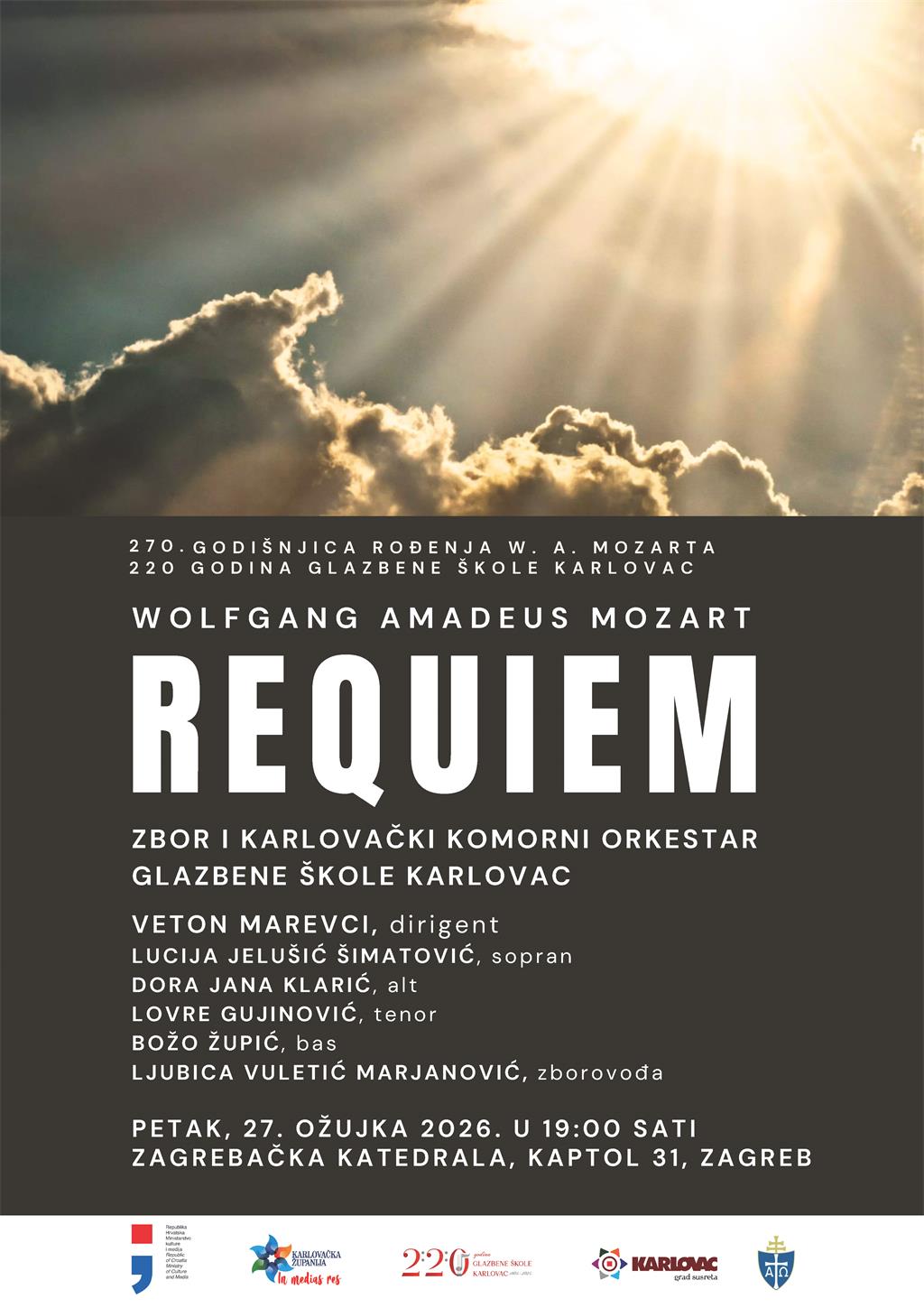 Requiema. Na pozornici će nastupiti zbor i Karlovački komorni orkestar Glazbene škole Karlovac, sastavljeni od učenika i nastavnika, pod ravnanjem dirigenta Vetona Marevcija, uz umjetničko vodstvo zbora dirigentice Ljubice Vuletić Marjanović. Solističke dionice izvest će Lucija Jelušić Šimatović (sopran), Dora Jana Klarić (alt), Lovre Gujinović (tenor) i Božo Župić (bas).