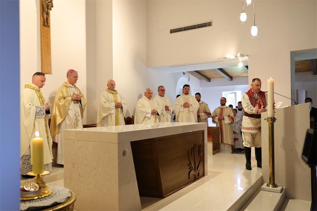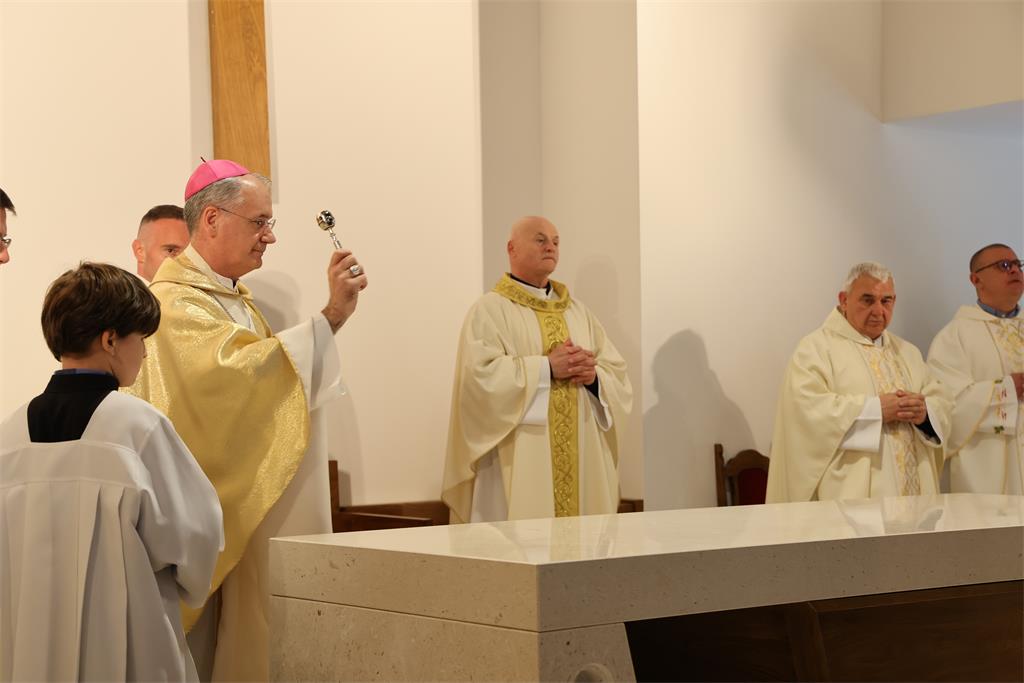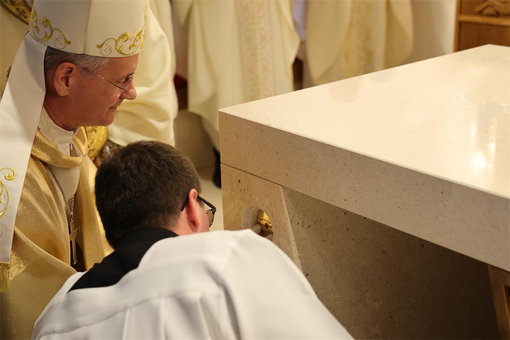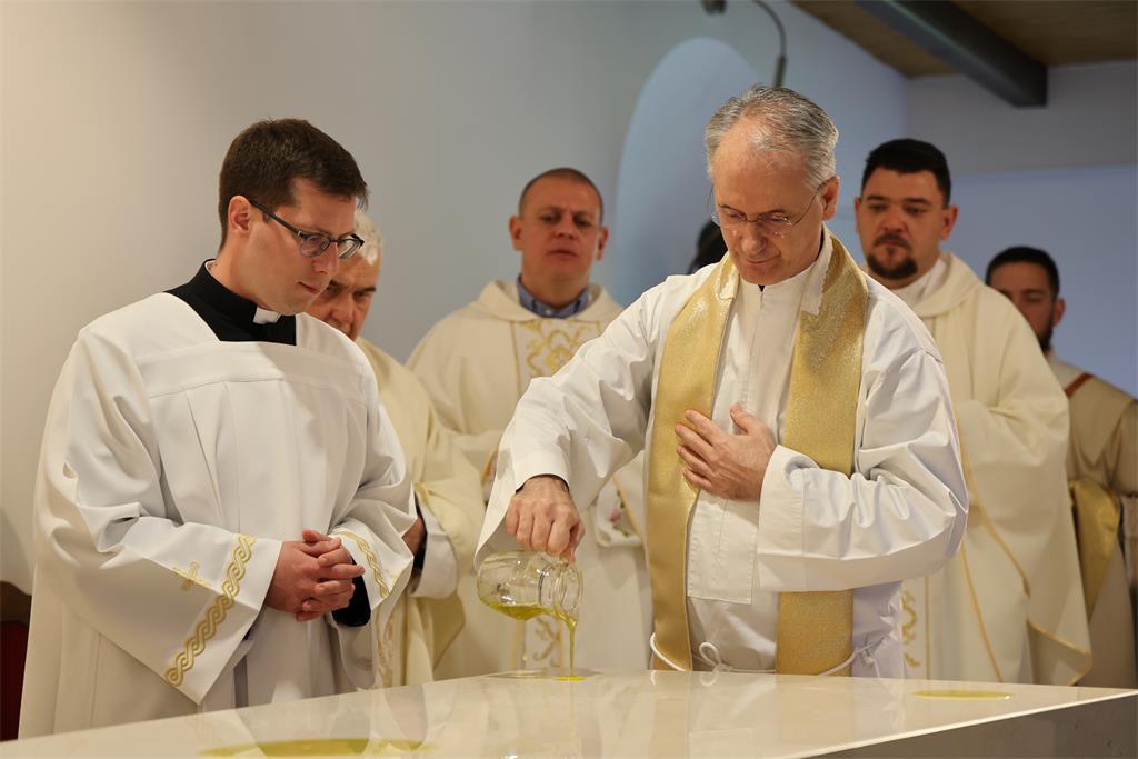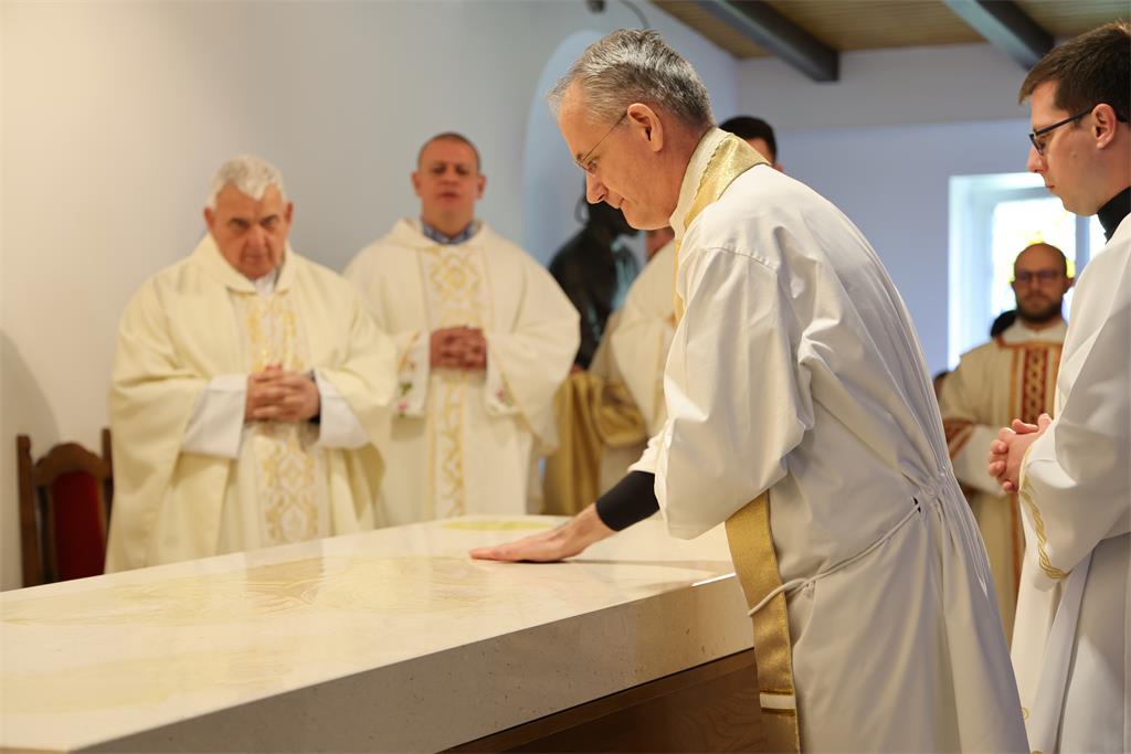 Nakon homilije i ispovijesti vjere okupljena zajednica zapjevala je Litanije svih svetih, a zatim je nadbiskup Kutleša u oltar položio moći bl. Alojzija Stepinca. Uslijedila je posvetna molitva, nakon koje je Nadbiskup izlio krizmu i pomazao oltar, a dekan preč. Ljubomir Vuković i župnik vlč. Branimir Budinski pomazali su posvetne križeve na stupovima u crkvi.