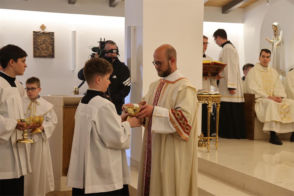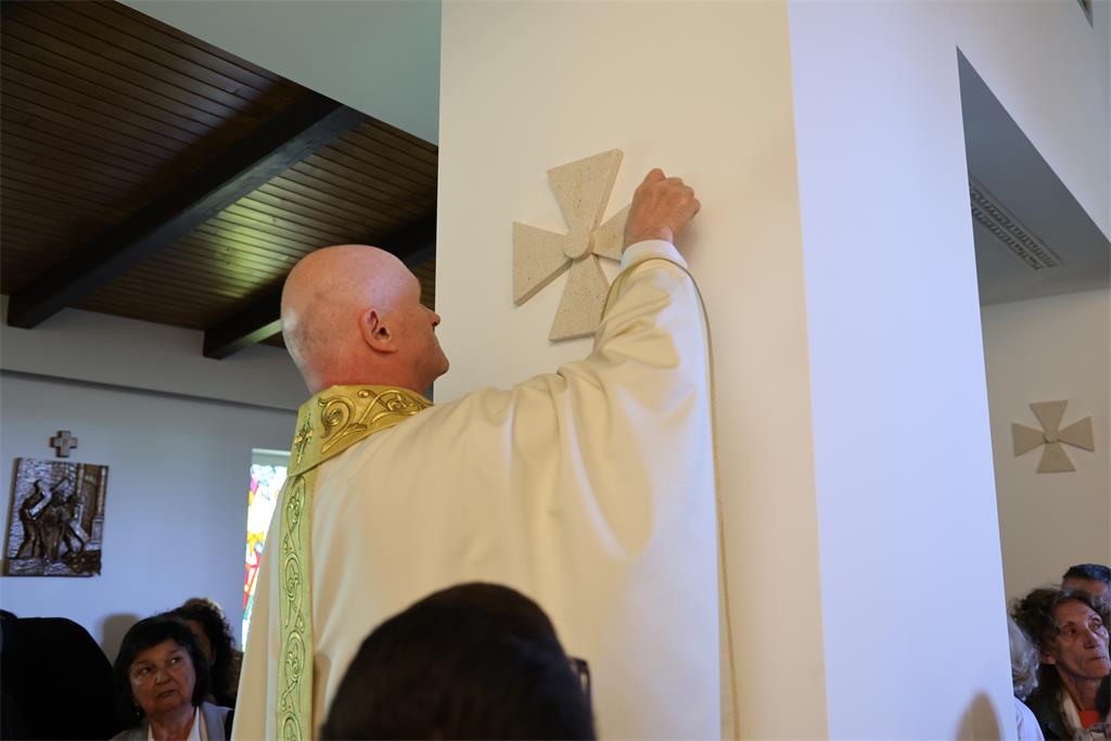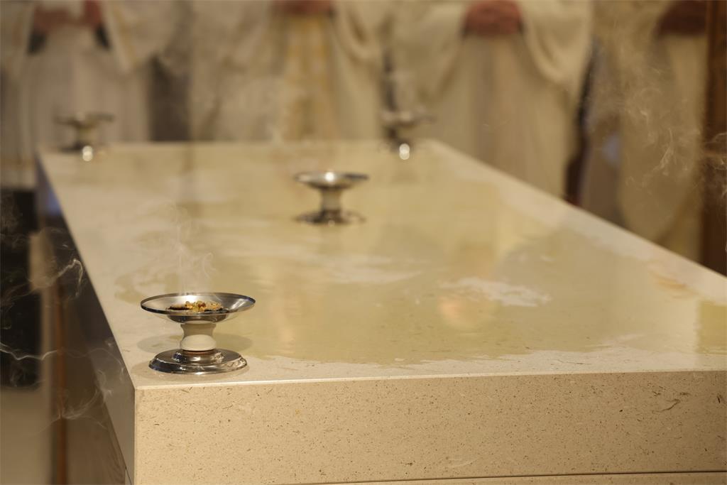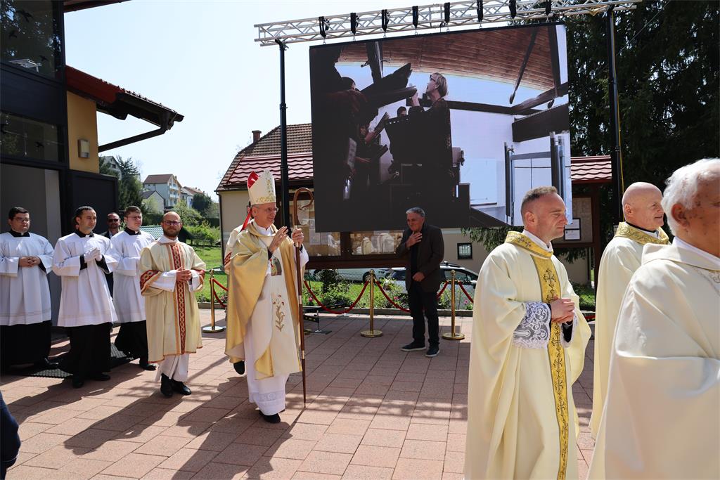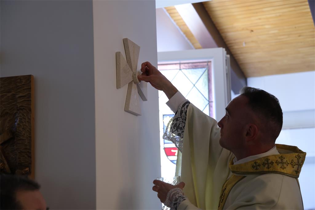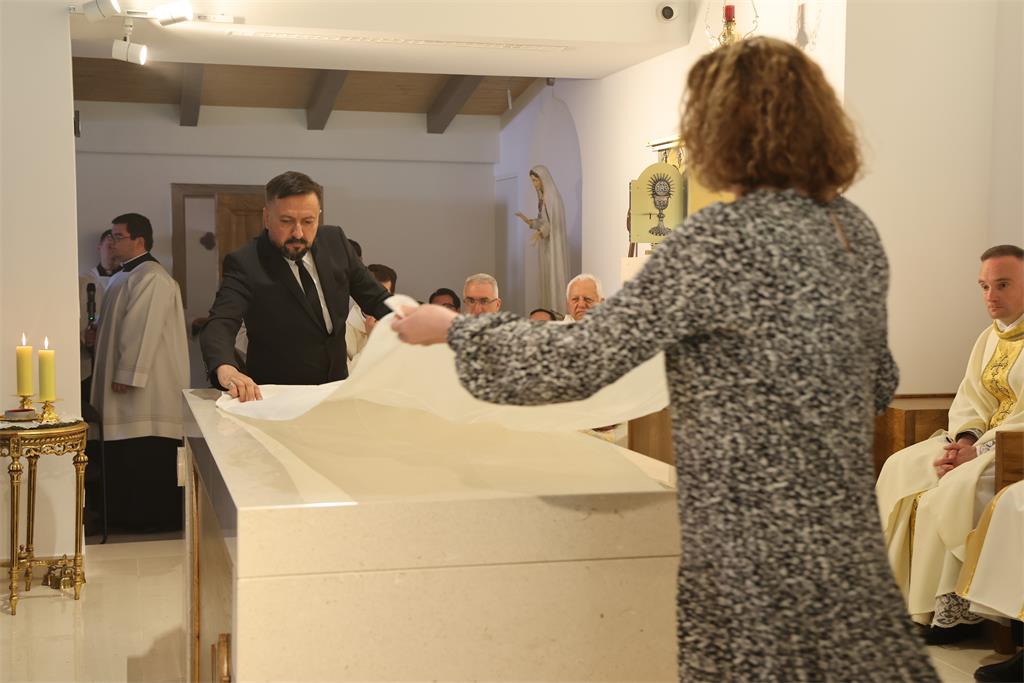 Nakon homilije i ispovijesti vjere okupljena zajednica zapjevala je Litanije svih svetih, a zatim je nadbiskup Kutleša u oltar položio moći bl. Alojzija Stepinca. Uslijedila je posvetna molitva, nakon koje je Nadbiskup izlio krizmu i pomazao oltar, a dekan preč. Ljubomir Vuković i župnik vlč. Branimir Budinski pomazali su posvetne križeve na stupovima u crkvi.