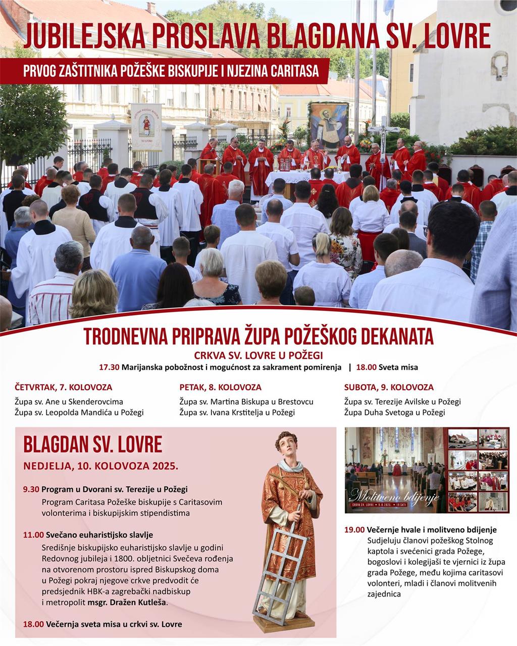 Na blagdan sv. Lovre, đakona i mučenika, zaštitnika Požeške biskupije, u nedjelju 10. kolovoza središnje biskupijsko euharistijsko slavlje u godini Redovnog jubileja i 1800. obljetnici svečeva rođenja na otvorenom prostoru ispred Biskupskog doma u Požegi pokraj njegove crkve u 11 sati predvodit će predsjednik HBK-a zagrebački nadbiskup i metropolit Dražen Kutleša u zajedništvu biskupa Đakovačko-osječke crkvene pokrajine.