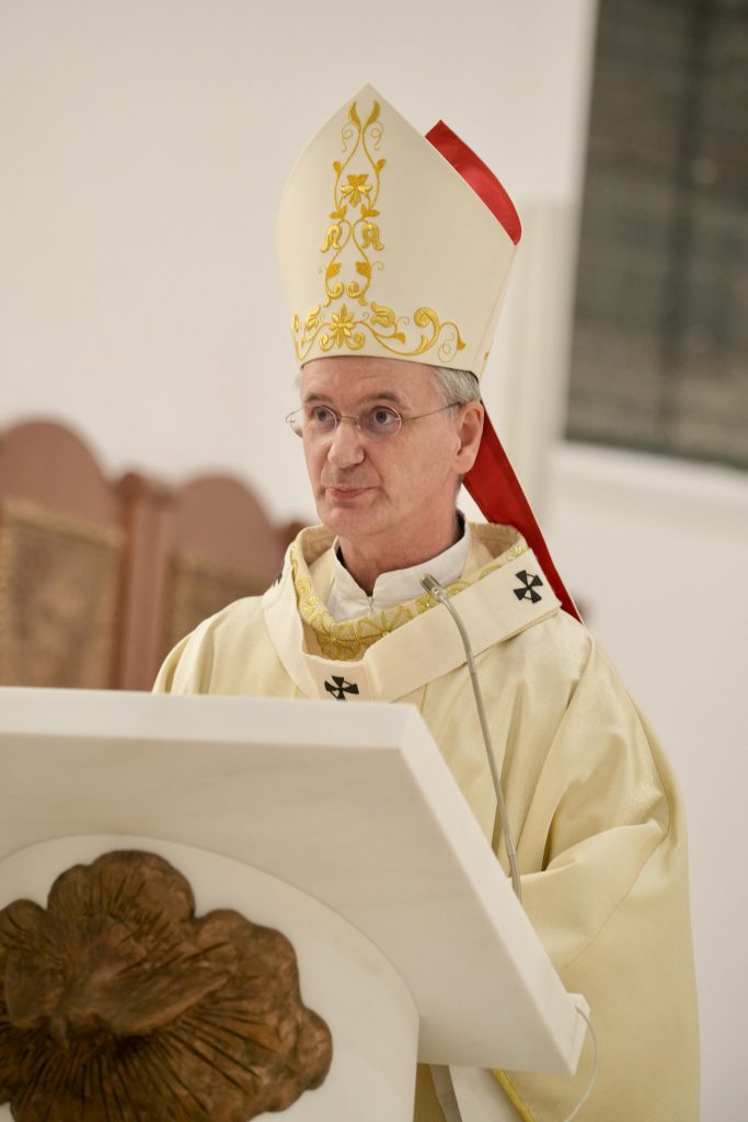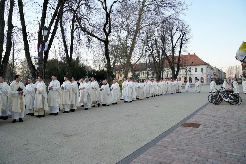 U homiliji je nadbiskup Kutleša uputio iskrene čestitke biskupu Huzjaku povodom obljetnice njegova biskupskog ređenja, a sve vjernike Biskupije preporučio blagoslovu Božjemu. Napomenuo je kako je svaka mjesna Crkva dijelom sveopće Crkve i kao Božji narodi ima nebeski značaj. Dodao je kako u ovom, ali i u svakom vremenu Crkva ima za cilj donositi nadu i usmjeravati prema vječnosti.
