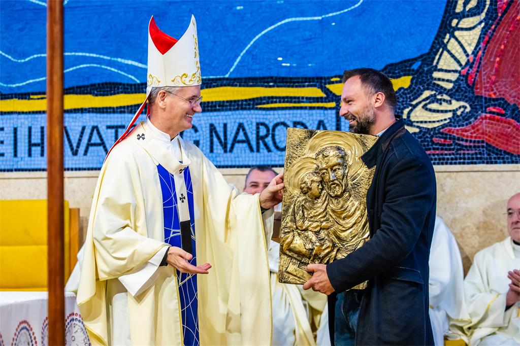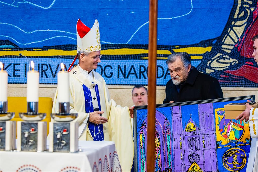 Prije završnog blagoslova mons. Sente uputio je zahvalu svima koji doprinijeli ovome slavlju te nadbiskupu Kutleši na njegovoj podršci, pomoći i prisutnosti. Nadbiskup Kutleša predao je plaketu Svetišta autorima blagoslovljenih umjetnina - kiparu Vidu Vučaku i slikaru Josipu Botteriju Diniju, dok su oni Nadbiskupu poklonili svoja umjetnička djela.