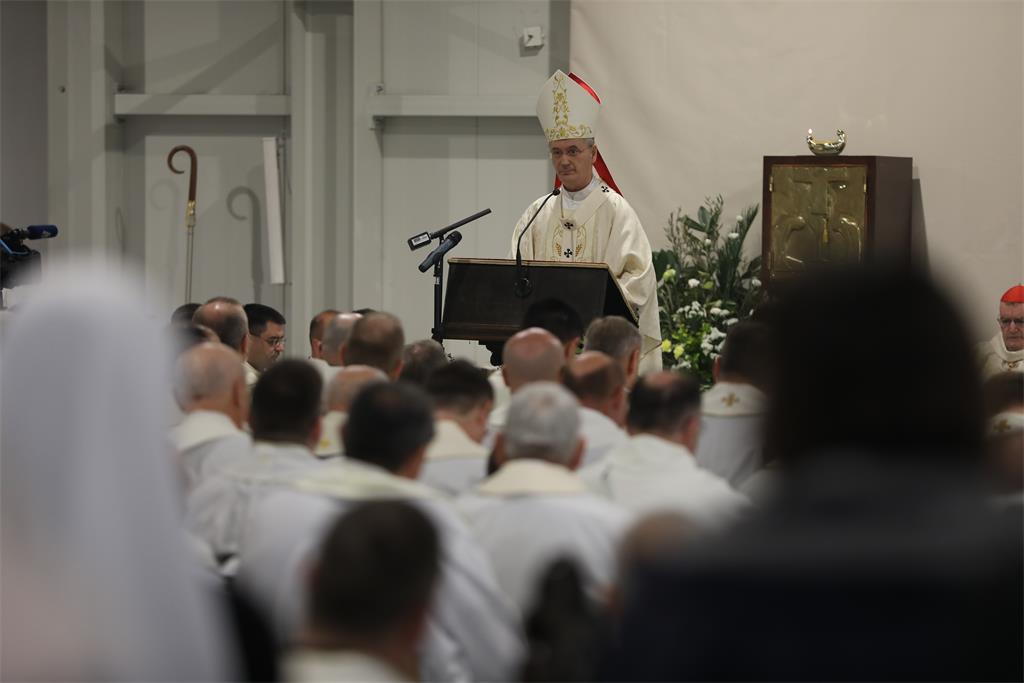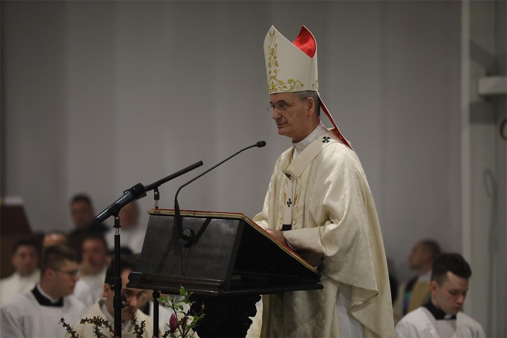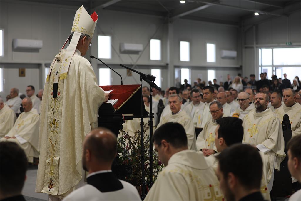 Nadbiskup je uputio pozdrav kazavši kako se "danas s dubokom vjerom i zahvalnošću spominjemo ustanovljenja presvete Euharistije i ministerijalnog svećeništva, dvaju darova ljubavi Krista Gospodina. U slavlje unosimo svakog našeg subrata svećenika, dijecezanskog i redovničkog, moleći Gospodina da nas sve obnovi u radosti i vjernosti svećeničkom poslanju, kako bismo jedni drugima bili braća, oslonac i potpora. Osobito danas molimo za našu braću koja su na bilo koji način opterećena, oslabljena ili iskušavana, a napose za one koji nose križ bolesti, da u zajedništvu s Raspetim Kristom pronađu snagu za strpljivo nošenje svoga križa znajući da nisu sami jer cijela Crkva s njima moli, nada se i ljubi."