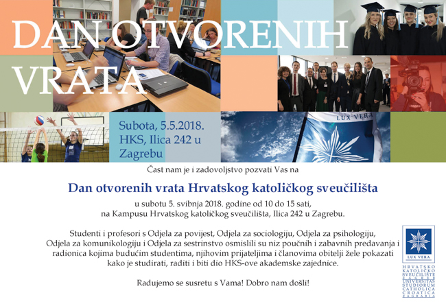 Hrvatsko katoličko sveučilište u subotu 5. svibnja 2018. godine od 10 do 15 sati s radošću otvara vrata svih svojih predavaonica, laboratorija, dvorana, ureda i s veseljem očekuje svoje posjetitelje.