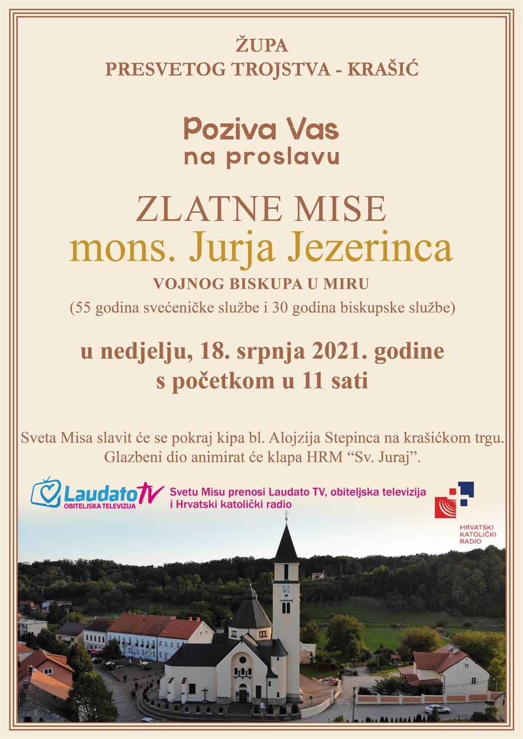 Mons. Juraj Jezerinac zahvalit će dragom Bogu i svim dobrim ljudima za 82. godine života, 55 godina svećeničke službe i 30 godine biskupske službe u nedjelju, 18. srpnja 2021. s početkom u 11 sati.