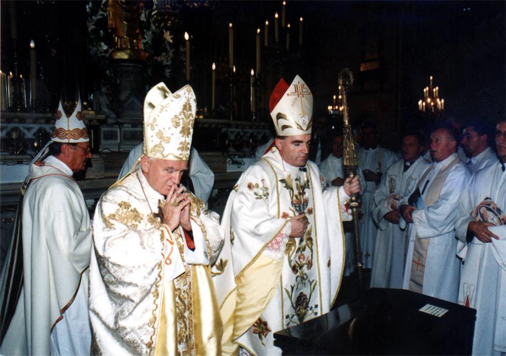 Dolazim, dakle, u duhu poslušnosti Božjoj volji koja se očitovala u odluci Svetoga Oca, kojemu i s ovoga mjesta obećavam iskrenu ljubav, trajnu vjernost i sinovsku odanost. A Vas, naš Papin predstavniče u Hrvatskoj, preuzvišeni gospodine mons. Giulio Einaudi, u ovom svečanom slavlju pozdravljam i molim da izraze moje odanosti i zajedništva prenesete svetom ocu Ivanu Pavlu II. Apostolska Stolica, kojoj ste Vi među nama predstavnik, nije samo jamac katoličkog zajedništva već nam to i davna i novija povijesna iskustva našega hrvatskog naroda svjedoče kako je čvrsta veza sa Svetom Stolicom djelotvoran oslonac crkvene, pa i nacionalne samobitnosti.