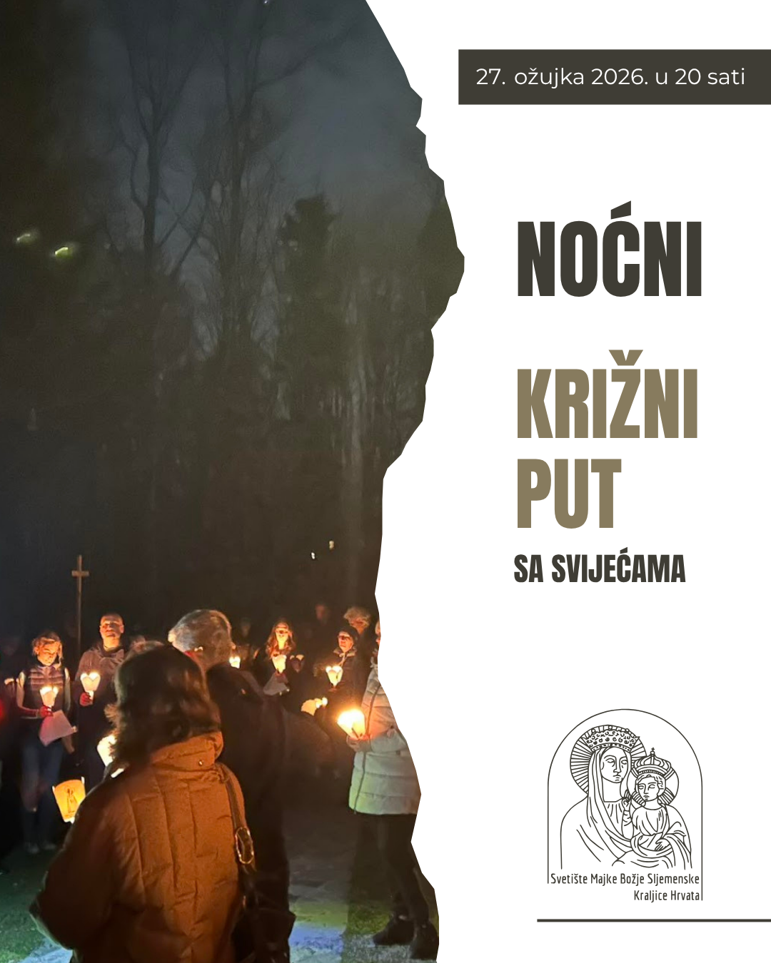 Noćni križni put pod svijećama održat će se na Sljemenu u petak 27. ožujka u 20 sati. Polazište je ispod župnog dvora na Sljemenu, a posljednja postaja završava u kapelici Majke Božje Sljemenske Kraljice Hrvata, na 1001 m nadmorske visine.