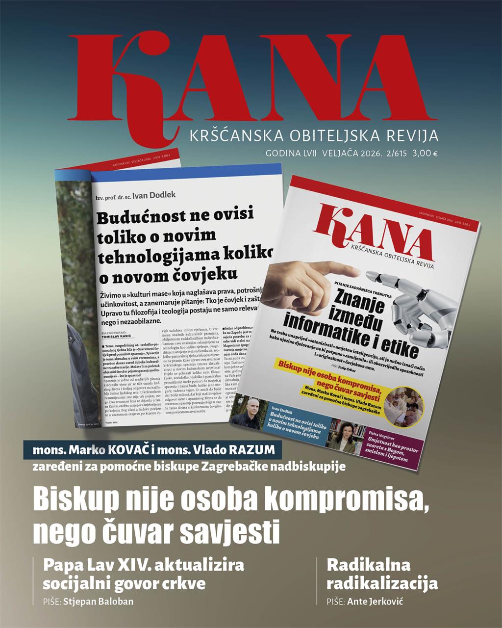 Kršćanske obiteljske revije Kana koja se u veljači dotiče niza važnih pitanja, među kojima je i ono kako živjeti s umjetnom inteligencijom, a ne prepustiti joj ono najvažnije, ljudsku slobodu, savjest i sposobnost razmišljanja. Crkva u tom promišljanju ne stoji po strani. Jasni i odgovorni poticaji pape Lava XIV. podsjećaju na to da problem nije u razvoju tehnologije, nego u načinu na koji ju koristimo. Ona može biti pomoć, ali ne smije postati zamjena za čovjeka, za njegov trud, nutrinu i odnos s Bogom. Josip Grbac u