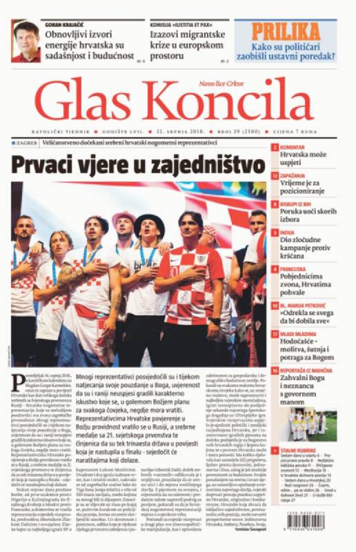 Događaj koji je kao malo koji do sada razveselio srca tolikih ljudi u Hrvatskoj te Hrvata u BiH i diljem svijeta - osvajanje srebra na Svjetskom nogometnom prvenstvu u Rusiji i veličanstveni doček hrvatske nogometne reprezentacije - dominira kao tema u novome broju Glasa Koncila, 29. u tekućoj godini, s nadnevkom od nedjelje 22. srpnja. Fotografija na naslovnici ovjekovječuje trenutak s dočeka „vatrenih" na glavnom zagrebačkom trgu, trenutak u kojemu nekoliko reprezentativaca i izbornik Zlatko Dalić u prvome planu odaju poštovanje prema „Lijepoj našoj".