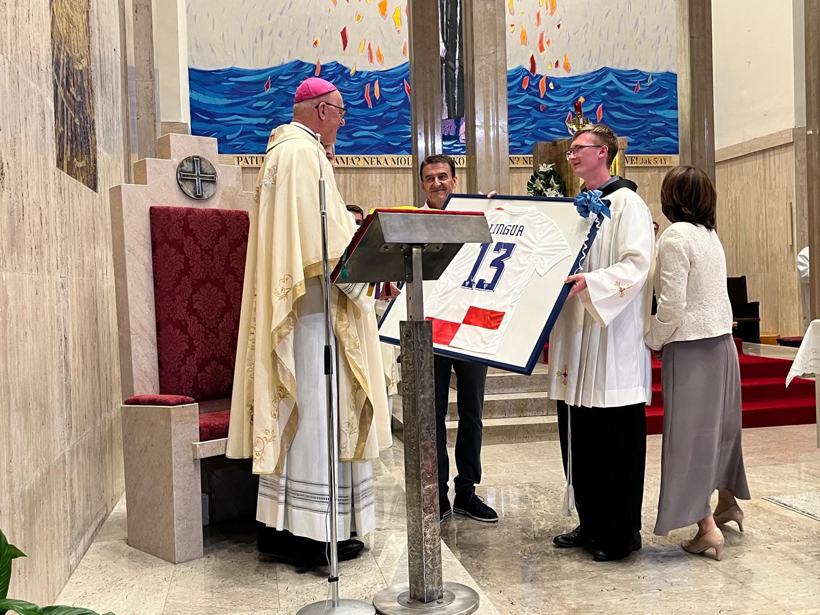 Na početku misnog slavlja nuncija su pozdravili predstavnici župljana Župe sv. Antuna Padovanskog. Prisjetivši se da je mons. Lingua strastveni navijač, poklonili su mu dres Hrvatske nogometne reprezentacije s njegovim prezimenom.
