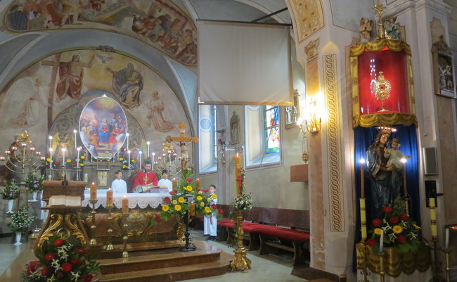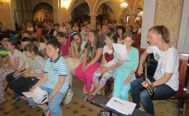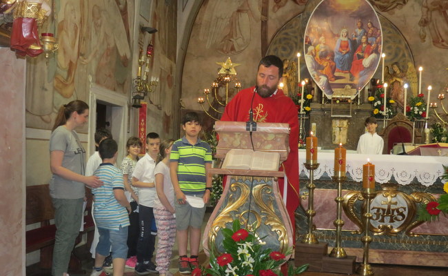 Po dolasku u Ludbreg, djeca i roditelji su se najprije uputili u župnu crkvu Presvetog Trojstva gdje ih je ludbreški kapelan Kristijan Stojko upoznao s poviješću župe i Euhristijskog čuda koje se u tom mjestu dogodilo prije šest stoljeća. Svetu Misu na čast Predragocjenoj Krvi Kristovoj predvodio je Gorazd Bastašić, svećenik Križevačke eparhije, čiji sinovi su također učenici Salezijanske osnovne škole. Djeca su u misnom slavlju aktivno sudjelovala ministriranjem, čitanjem molitve vjernika, prinosom darova te pjevanjem. Po svršetku sv. Mise, hodočasnike je pozdravio ludbreški župnik mons. Josip Đurkan, zahvalivši im na dolasku i pobožnosti.
