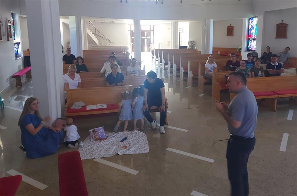 Nakon ručka djeca su sa župnim animatorima sudjelovala na radionicama i igrama, a roditelji i starija djeca iz obitelji slušali katehezu i svjedočanstvo bračnog para. Mladi bračni par Kristina i Stjepan sa svoje troje male dječice govorili su o zajednici „Dodir Ljubavi“, kojoj sami pripadaju. Posvjedočili su kako dugo nisu mogli imati djece. Svojim snagama, putem raznih metoda koje Crkva podupire, pokušali su dobiti djecu, no bezuspješno. Tek kad su prepustili Bogu svoje molitve i čežnje, kada su se otvorili djelovanju Duha Svetoga, Gospodin je učinio svoje. Osam su godina u braku i zasad imaju troje djece. U svom svjedočanstvu istaknuli su kako im zajednica puno znači te ohrabrili sve prisutne da ne odustanu od molitve zajednice jer, uz ljude s kojima možeš zajedno slaviti i zahvaljivati Gospodinu, podijeliti poteškoće u obitelji, sve je lakše. Vlč. Ivan Lastovčić nakon svjedočenja bračnog para održao je katehezu o Marti, Mariji i njihovom bratu Lazaru. Vlč. Lastovčić naglasio je kako je Isus rado dolazio u obitelji, njihove domove. Na primjeru Marte, Marije i Lazara pojasnio je kakav odnos mora biti između čovjeka i Boga te kako je u životu potrebno i slušati i činiti.