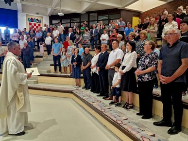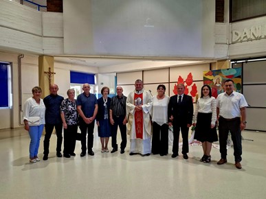 U homiliji vlč. Risek kazao je kako "ovu nedjelju slavimo rođenje naše Crkve kojoj pripadamo. Crkva je zajednica Duha Svetoga. On je stvorena zahvatom s neba. Djelovanje Duha je poput silna vjetra i vatre. Vjetar puše gdje hoće. Ništa ga ne može zaustaviti. Snaga vatre je zastrašujuća. Ona mijenja sve što zahvati. Ono što je slabo i nestalno pred njom nestaje, ono što je jako i postojano ostaje i biva još jače, još postojanije. Takva je sila Duha Svetoga. Crkva živi i djeluje njegovom snagom. I samo snaga Duha, koji djeluje na različite načine i u različitim darovima, može Crkvu trajno uzdržavati da odoli svakoj neprijateljskoj sili te da svijetu naviješta veličanstvena djela Božja. Neka nas Duh Sveti još više zbliži, a posebno molim danas da zbliži današnje slavljenike, ali i sve bračne parove u našoj župi da budemo svi zajedno povezaniji onom čistom, pravom Isusovom ljubavlju da naši životi budu bogatiji pred ljudima i Bogom", istaknuo je vlč. Risek.