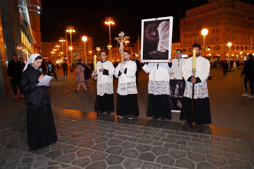 Križni put za nerođene u Zagrebu je počeo kod Kamenitih vrata. Postaje su predmolili svećenici, redovnici i redovnice, križ i slike postaja križnog puta nosili su ministranti Župe Marije Pomoćnice kršćana s Knežije, a pjesmu "Stala plačuć' tužna mati" pjevala je muška klapa. Slike postaja križnog puta replike su umjetnice Iris Mihatov Miočić, a originali se nalaze u župi Bezgrješnog začeća Blažene Djevice Marije u Zadarskoj nadbiskupiji.