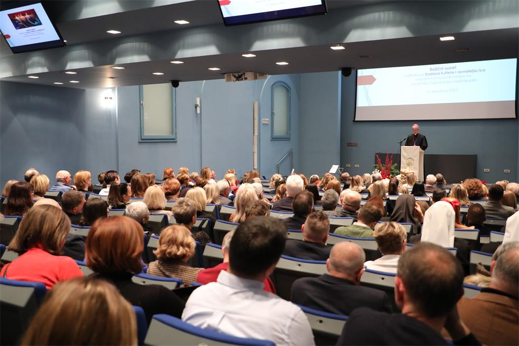 Predbožićni susret zagrebačkog nadbiskupa mons. Dražena Kutleše i ravnateljica i ravnatelja predškolskih, osnovnoškolskih i srednjoškolskih ustanova u Zagrebačkoj nadbiskupiji održan je u utorak 16. prosinca 2025. u dvorani "Vijenac" u Nadbiskupijskom pastoralnom institutu u Zagrebu.