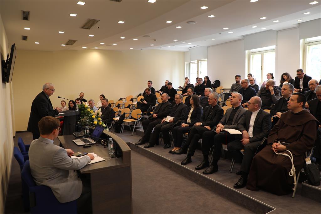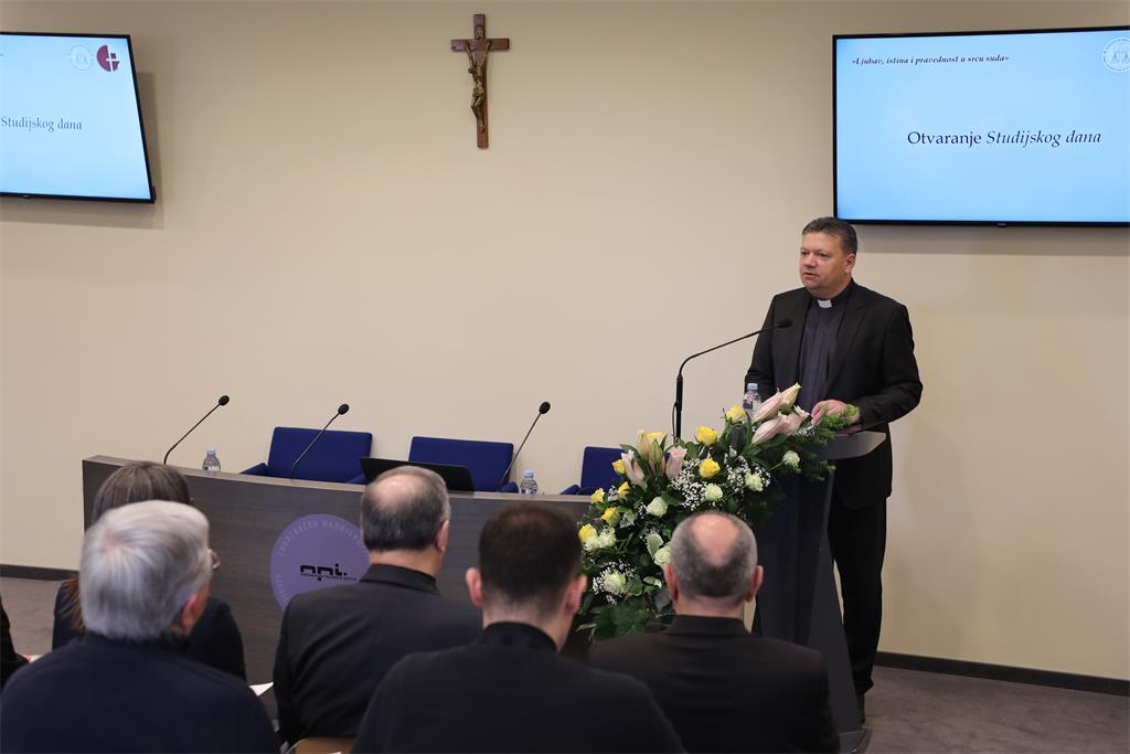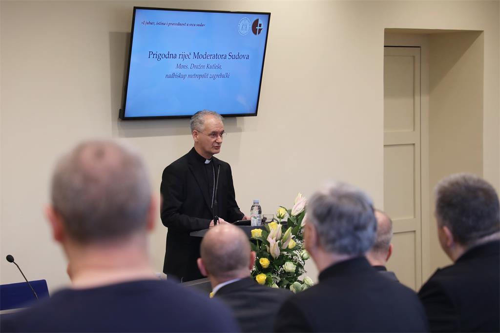 uvodni govor izrekao je i mons. Dražen Kutleša, nadbiskup metropolit zagrebački i moderator Međubiskupijskih sudova u Zagrebu. Izrazio je poštovanje i iskrenu zahvalnost na crkvenoj službi koju vrše službenici crkvenih sudova. "Dragocjen i odgovoran posao, koji ste pozvani obavljati uime i po nalogu Crkve, vršite skrovito i bez puno buke, a opet otvorena srca i otvorenih vrata za sve koji vam se obrate", kazao je nadbiskup Kutleša. Između ostalog, istaknuo je da Studijski dan "pruža mogućnost promišljanja o tri temeljna načela kanonskoga sudovanja: ljubav (