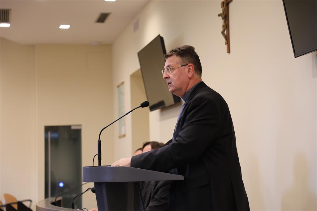 Nakon molitve preč. Lukić, koordinator TFS-a, pozdravio je Biskupa, Kancelara i preč. Vukovića te sve okupljene svećenike, najavivši program susreta.