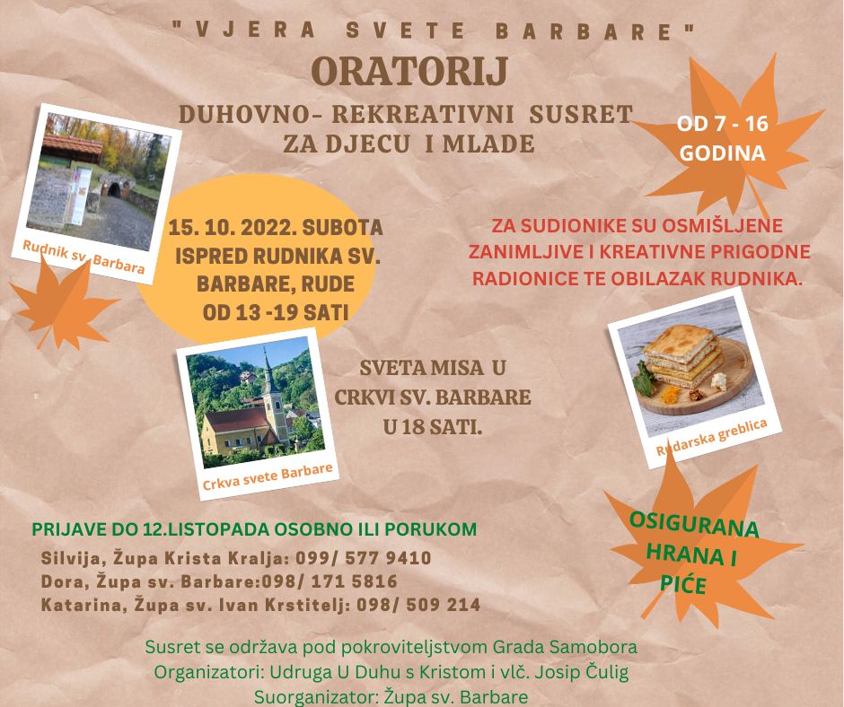 U Župi sv. Barbare u Rudama u subotu 15. listopada 2022. održat će se oratorij za djecu od 7 do 16 godina pod geslom "Vjera svete Barbare".